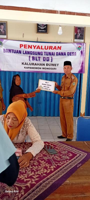 Duwet (SIDA). Bantuan Langsung Tunai (BLT) tahap 11 dan 12, kemarin hari Selasa (30/12/2025) telah diserahkan kepada keluarga penerima manfaat bantuan tersebut. Penyerahan Bantuan Langsung Tunai dimulai pada pukul 08.30 WIB, bertempat di Aula Balai Kalurahan Duwet. Jumlah Keluarga penerima manfaat Bantuan Langsung Tunai sejumlah 14 orang, masing-masing mendapatkan bantuan sejumlah Rp. 600.000 untuk 2 (dua) tahap, yaitu tahap 11 (sebelas) dan 12 (dua belas).