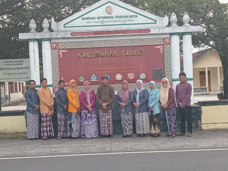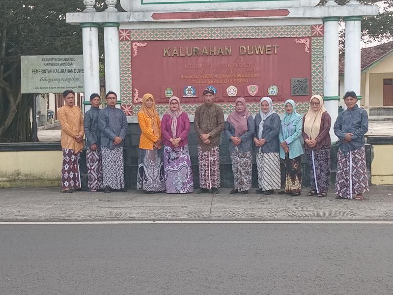 Duwet(SIDA). Hari ini Kamis(12/03/2026) bertepatan dengan Kamis Pon. Berdasarkan Surat Edaran Gubernur Provinsi Daerah Istimewa Yogyakarta yang mewajibkan Aparatur Sipil Negara (ASN), dan Pelajar mengenakan pakaian adat jawa gagrak Yogyakarta setiap Kamis Pon, termasuk Pamong Kalurahan Duwet yang pada hari ini juga mengenakan busana adat Yogyakarta. Pakaian yang digunakan untuk laki-laki terdiri dari, surjan, kain jarik motif Yogyakarta, blangkon dan untuk perempuan mengenakan kebaya berbahan lurik atau warna polos dan jarik.